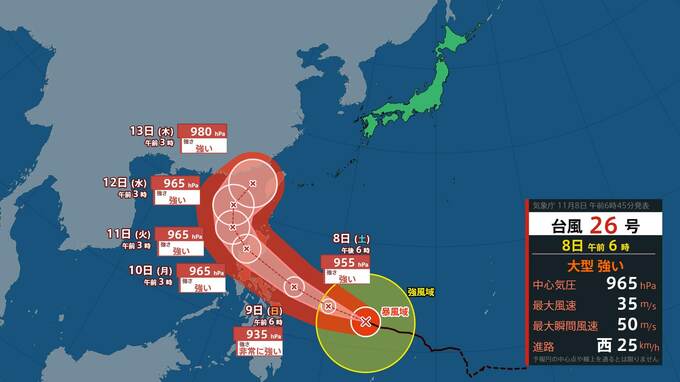 気象庁によりますと、台風26号は8日午後3時現在、フィリピンの東の北緯13度00分、東経130度35分を1時間に約30キロの速さで西へ進んでいます。中心気圧は955ヘクトパスカル、中心付近の最大風速は40メートル、最大瞬間風速は60メートルとなっています。
