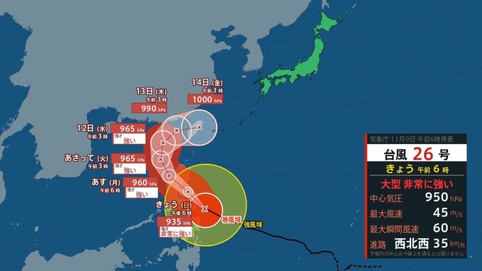 中心の気圧は935ヘクトパスカル、中心付近の最大風速は50メートル、最大瞬間風速は70メートルが予想されます。