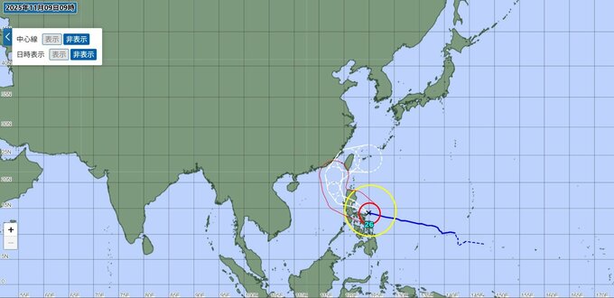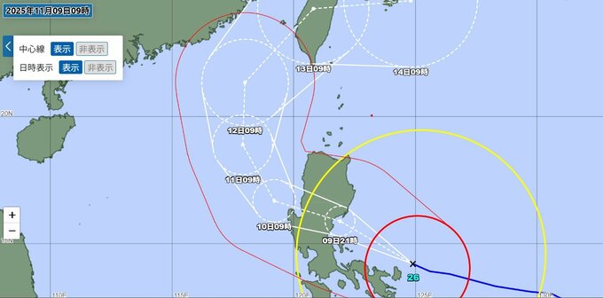 台風の予報進路は、予報の期間が長くなるほど誤差の幅(予報円)が大きくなります。最新の情報を確認するようにしてください。