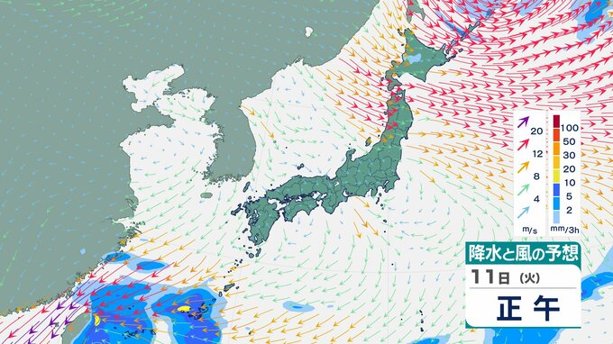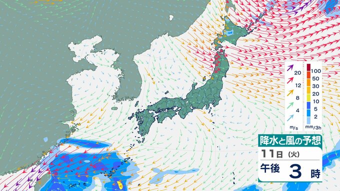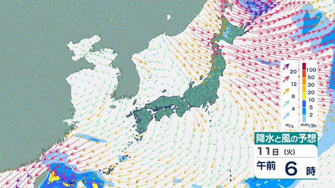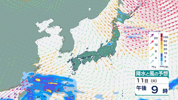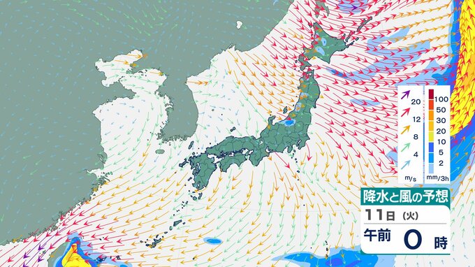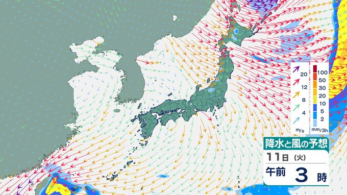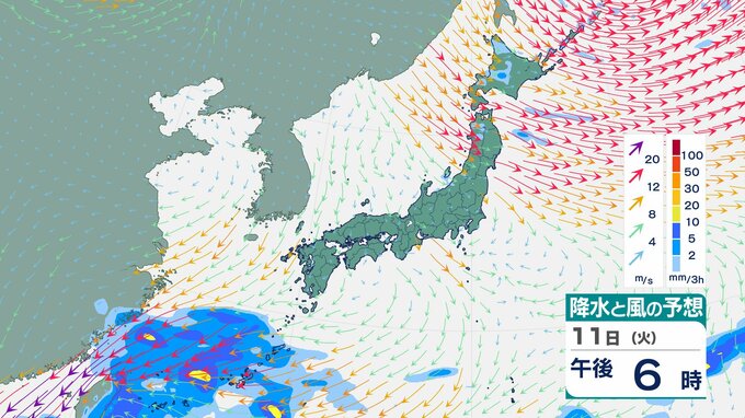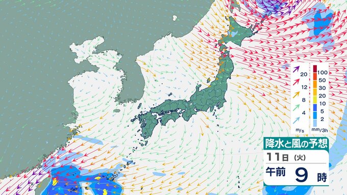 ニュースクリップ 【台風情報】大型で非常に強い台風26号(フォンウォン)この後どこへ?ぐるっと円を描くように…急カーブで沖縄方面へ【雨と風のシミュレーション】 2025年11月9日(日) 13:22 国内 天気 11日(火)雨と風のシミュレーション画像