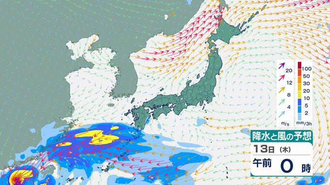 ニュースクリップ 【台風情報】大型で非常に強い台風26号(フォンウォン)この後どこへ?ぐるっと円を描くように…急カーブで沖縄方面へ【雨と風のシミュレーション】 2025年11月9日(日) 13:22 国内 天気 13日(木)雨と風のシミュレーション画像