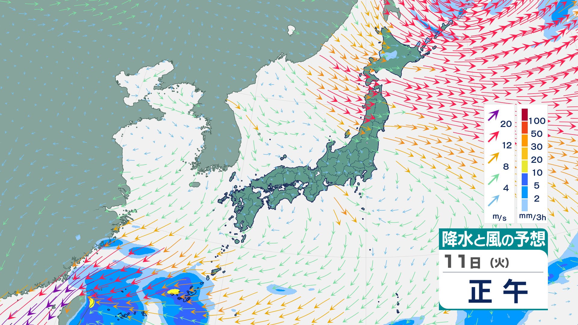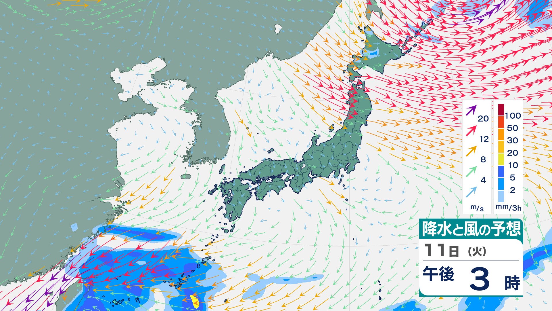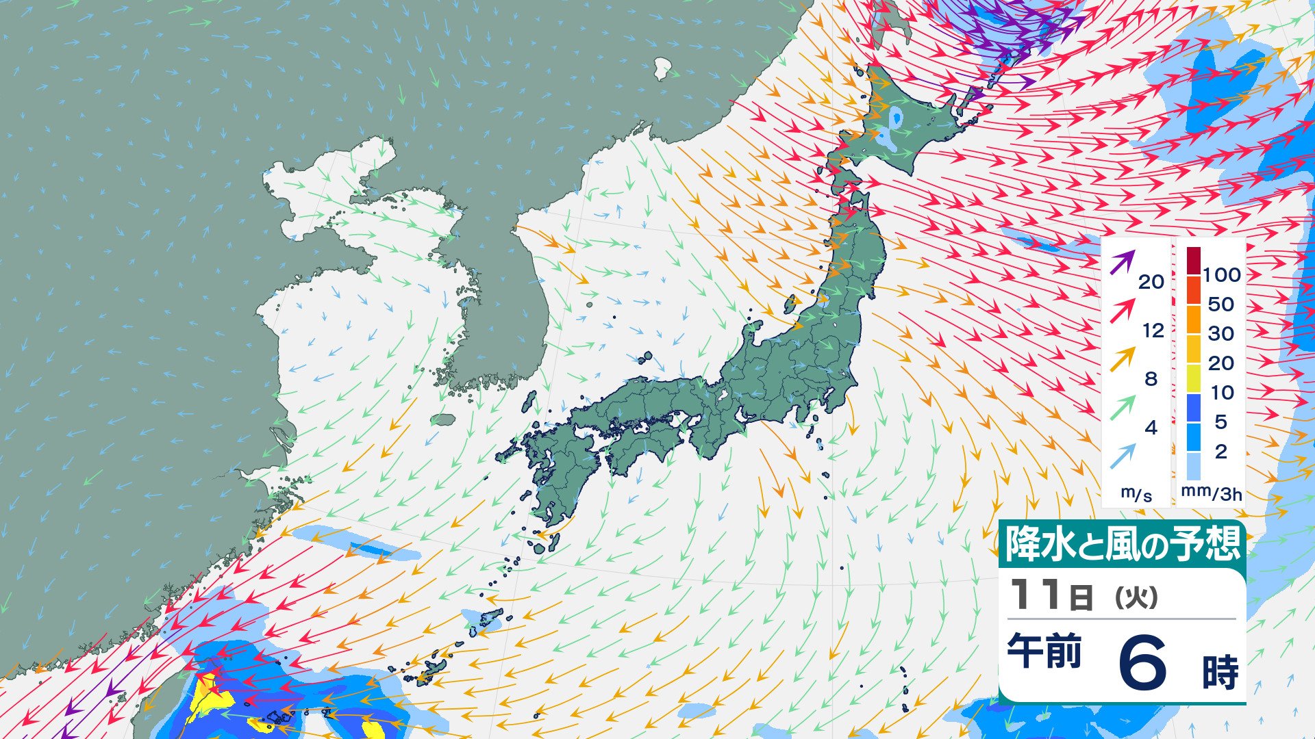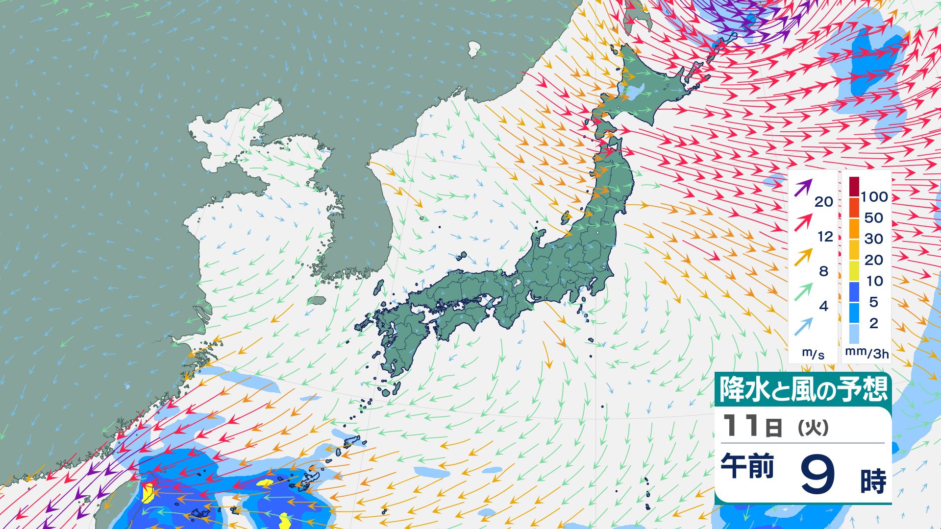 ニュースクリップ 【気象情報】北陸地方は10日はこの時期としては強い寒気が流れ込む見込み 大気の状態が非常に不安定に 明け方から夕方にかけて落雷や竜巻などの激しい突風に注意【雨と風のシミュレーション】 2025年11月9日(日) 16:15 国内 天気 11日(火)雨と風のシミュレーション