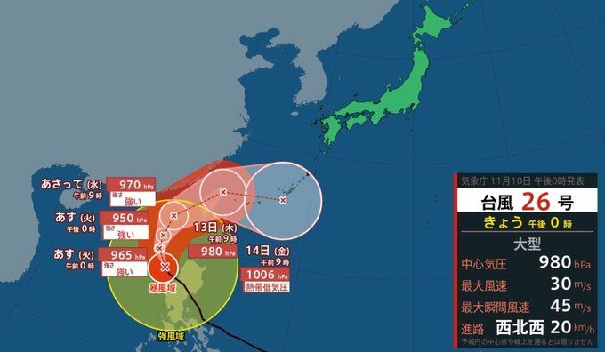 気象庁によりますと、台風26号は10日正午現在、南シナ海にあり、大型の勢力を維持しています。中心気圧は980hPa、中心付近の最大風速は30m/s、最大瞬間風速は45m/sとなっています。