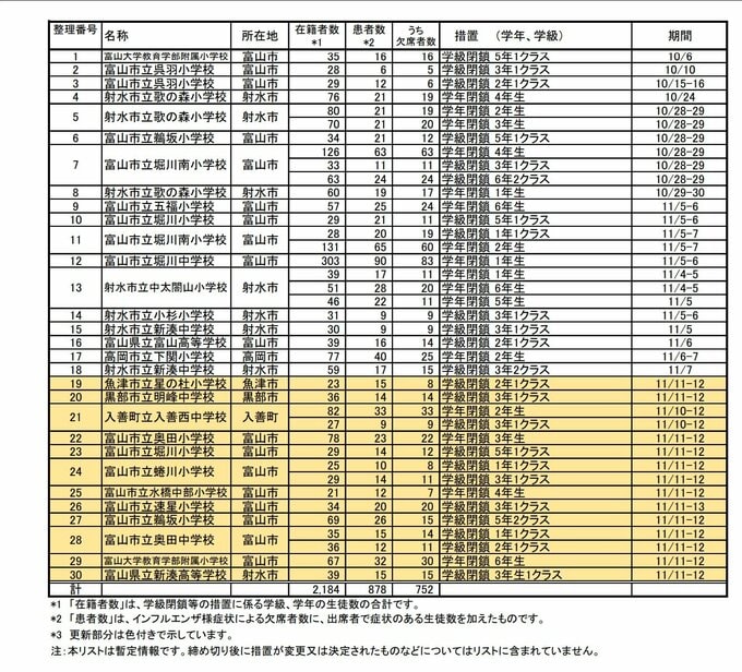 発表によりますと10月6日に富山大学教育学部附属小学校の5年1クラスで学級閉鎖が実施されたのを皮切りに、10月中旬から11月にかけて閉鎖措置が急増しています。