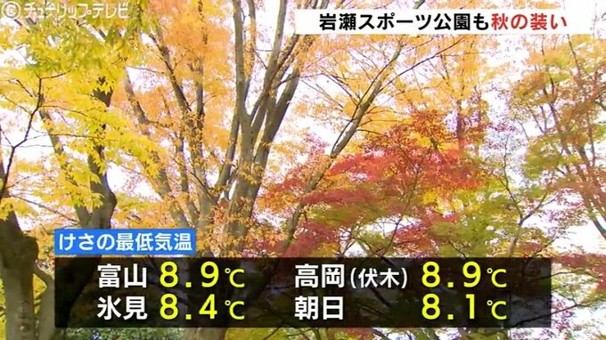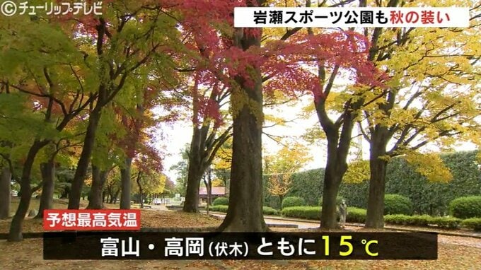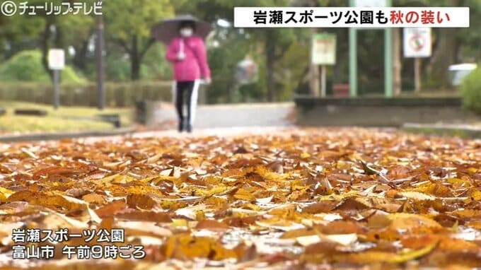 西高東低の気圧配置の影響で県内は明け方まで雨の降ったところもありますが、次第に高気圧に覆われ曇りや晴れとなっています。平野部での紅葉が進む中、富山市の岩瀬スポーツ公園ではもみじの葉が赤く色づき始め、歩道には落ち葉のじゅうたんと秋の景色が広がっています。