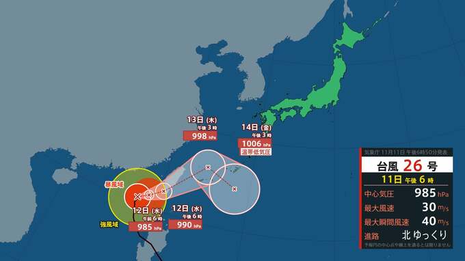 沖縄気象台によりますと、台風第26号は11日午後6時現在、南シナ海の北緯20度35分、東経117度55分にあって、ゆっくりした速さで北へ進んでいます。