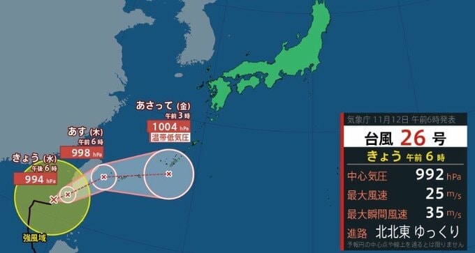 気象庁によりますと、台風26号は12日午前6時現在、バシー海峡に位置し、中心気圧は992hPa、中心付近の最大風速は25m/s、最大瞬間風速は35m/sとなっています。強風域は北西側で330km、南東側で280kmに広がっています。