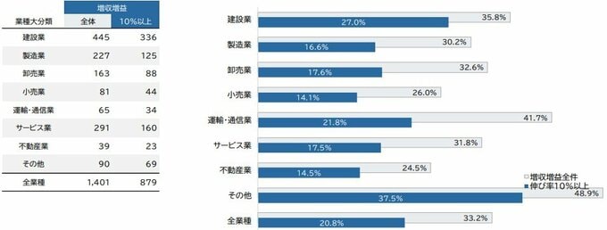 増収増益企業を業種別にみると、建設業が445社と最多となり、能登半島地震の復興需要などが業績を押し上げました。建設業では4社に1社以上が前年比10%以上の増収増益を達成しています。