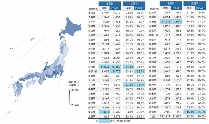 全国の都道府県別では、増収増益企業の出現率トップは「石川県」の36.9%で、「沖縄県」が35.3%、「東京都」が34.5%と続きました。石川県と沖縄県では伸び率10%以上の企業が24.9%と最高水準を示しています。