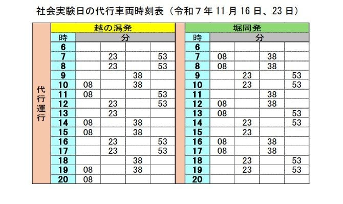運行時間は堀岡発の午前7時8分から越の潟発の午後8時8分までとなっています。