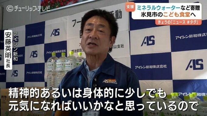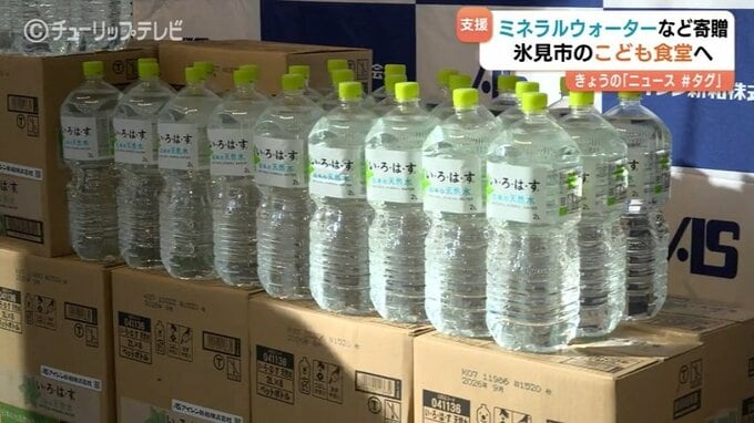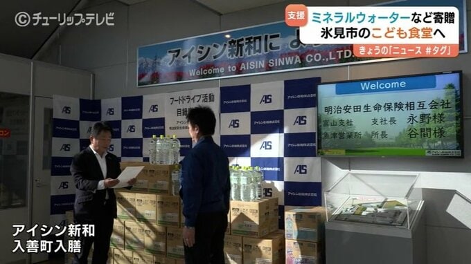 富山県入善町の自動車部品メーカー、アイシン新和が明治安田生命保険などを通じて氷見市のこども食堂にミネラルウォーターなどを寄贈しました。