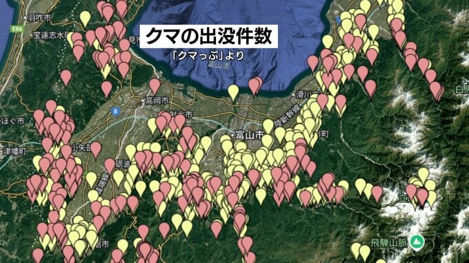 富山県内では10月1か月間の出没が420件。11月11日までの累計は863件に達し、同じ10月の過去10年平均の約3倍となっています。“準大量出没”とされた2023年をもすでに大きく上回る異常事態です。