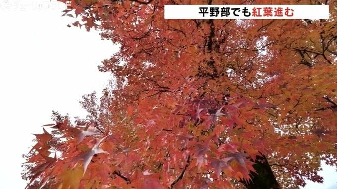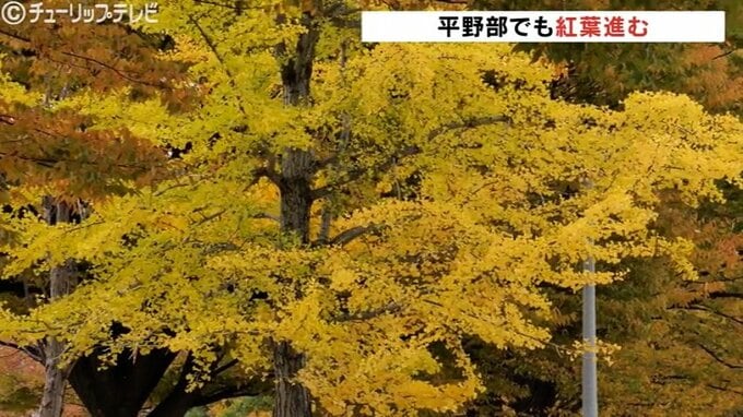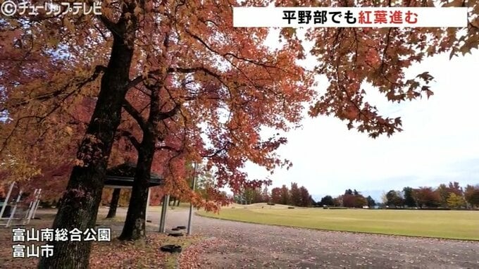 気温が下がってくるのとともに平野部でも紅葉が進み富山市の富山南総合公園では街路樹が秋を彩る見事なコントラストを魅せています。