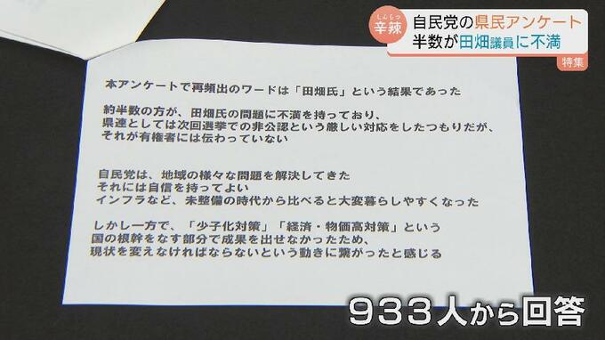 「私達はこのアンケートを取って、生の県民の声が得られたというふうに思ってるんで。不満不信の声をしっかり本人に伝えるまでするのがこのアンケートを取った私達の仕事だというふうに思っておりますんで、しっかり伝えていきたいというふうに思います」