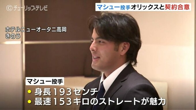 15日、オリックスとの入団交渉に臨んだマシュー投手。交渉の結果、支度金300万円、年俸240万円で契約合意に至りました。(金額は推定)