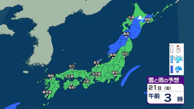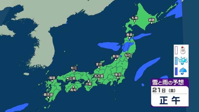 【気象情報】東北地方は17日から19日頃にかけて冬型の気圧配置となり日本海側の平地でも雪の積もる所が…太平洋側の山沿いも雪が積もる見込み 積雪や路面の凍結、大雪による交通障害に注意【雪と雨のシミュレーション】 2025年11月16日(日) 13:10 国内 天気 21日(金)雪と雨の予想