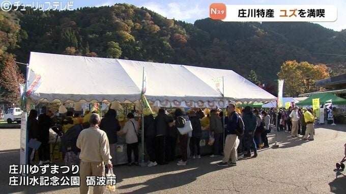 収穫したばかりのユズを楽しむイベント「庄川ゆずまつり」が、16日、富山県砺波市の庄川水記念公園で開かれ生産者らが収穫したばかりのユズを販売しました。