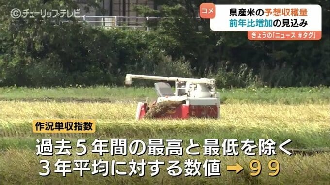 また、ことし新たに導入された過去5年間のうちの、最高と最低を除いた3年間の平均に対する10アールあたりの予想収穫量を示す作況単収指数は99となっています。