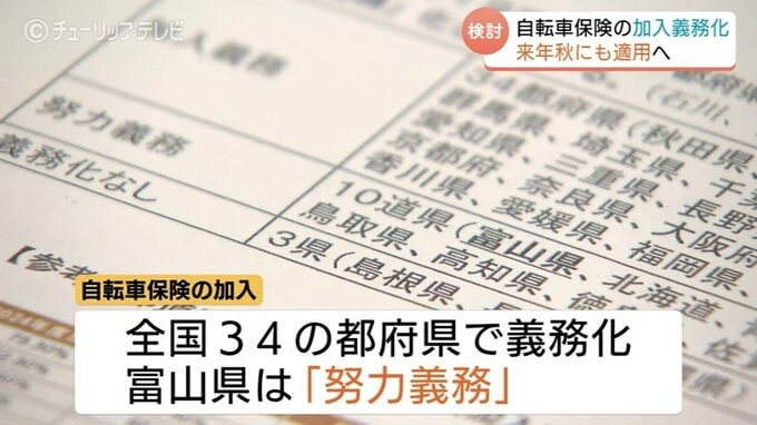 これは19日開かれた富山県の自転車活用推進連絡会議で方針が示されたものです。自転車保険の加入を巡っては、全国で34の都府県ですでに義務化されていて、富山県は「努力義務」となっています。