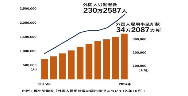 なお、全国の外国人労働者数は2024年10月時点で230万2,587人、外国人雇用事業所数は34万2,087か所に達しています。