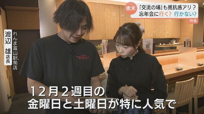 「12月2週目の金曜日と土曜日が特に人気で、問い合わせもたくさんいただいています。いつもだったら仕事納めくらいの時期に忘年会とかも多かったりするんですけど、今年は1週目・2週目の問い合わせが多くて例年より少し早い時期に忘年会をやるのかなっていうイメージもあるんですけど」