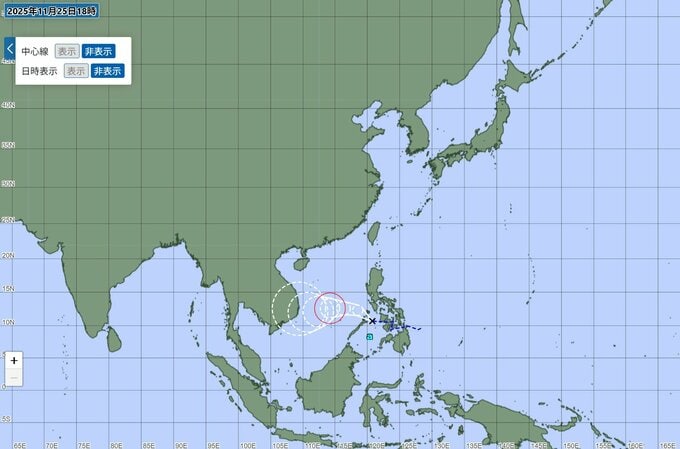 台風の予報進路は、予報の期間が長くなるほど誤差の幅(予報円)が大きくなります。最新の情報を確認するようにしてください。