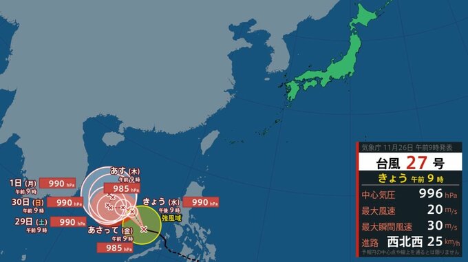 ▼27日午前9時の予報では、台風の進行速度は「ゆっくり」となり、進行方向は西に変わります。中心気圧はさらに985hPaまで低下し、中心付近の最大風速30m/s、最大瞬間風速40m/sに強まる見通しです。