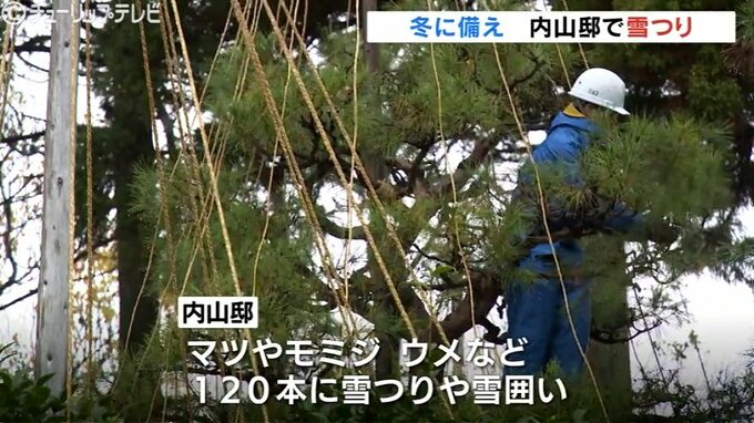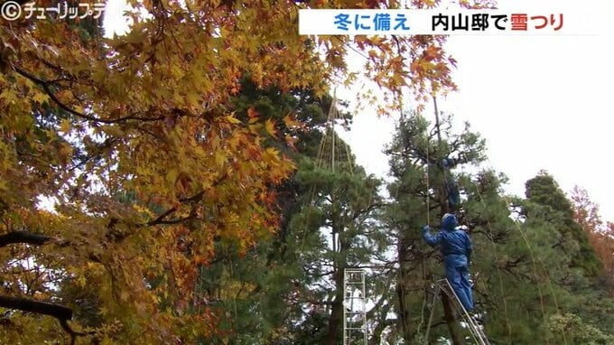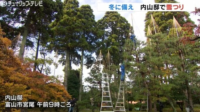 これは湿気の多い北陸特有の雪の重みで枝が折れるのを防ぐためのもので造園業者が高さ約10メートルのマツなどに支柱を取り付け、枝一本一本に縄を結びつけていました。