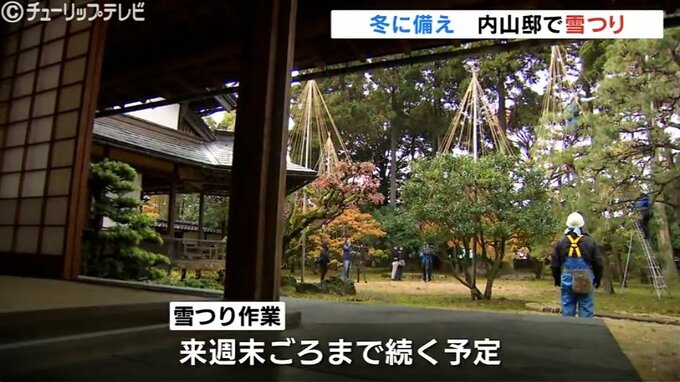 26日、本格的な冬に備え富山市にある国の登録有形文化財・内山邸では、庭園の雪吊り作業が行われています。