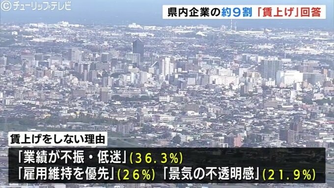 一方、「賃上げを実施しない」とした企業は理由について、「業績が不振・低迷」(36.3%)、「雇用維持を優先」(26%)、「景気の不透明感」(21.9%)などを挙げました。
