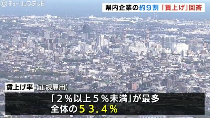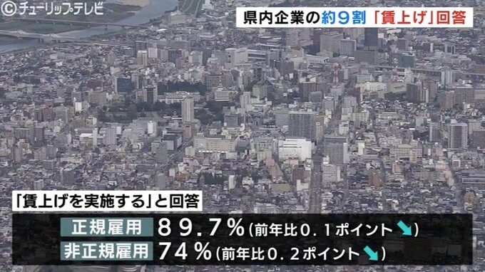 それによりますと、「賃上げを実施する」と回答した県内企業は、▼正規雇用が89.7%(前年89.8%)▼非正規雇用が74%(前年74.2%)といずれも前の年から横ばいとなりました。