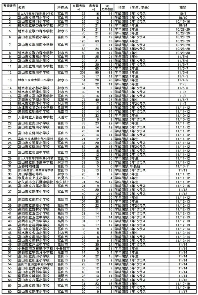 ニュースクリップ 【速報】富山県 インフルエンザ患者数2859人 前週から1199人増で “警報レベルの2倍(1医療機関あたりの患者数)” 流行開始から約1か月も拡大止まらず 2025年11月26日(水) 15:27 国内 暮らし・マネー 学級閉鎖等の状況(富山県公表分)1頁