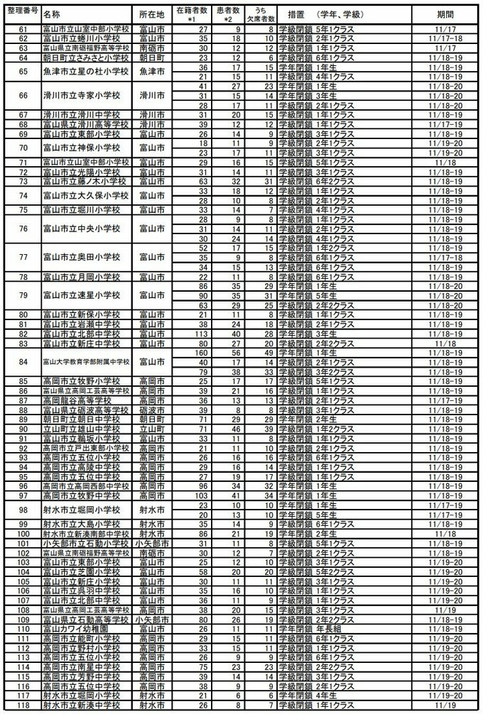 ニュースクリップ 【速報】富山県 インフルエンザ患者数2859人 前週から1199人増で “警報レベルの2倍(1医療機関あたりの患者数)” 流行開始から約1か月も拡大止まらず 2025年11月26日(水) 15:27 国内 暮らし・マネー 学級閉鎖等の状況(富山県公表分)2頁