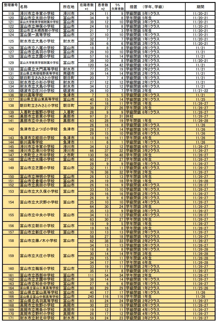ニュースクリップ 【速報】富山県 インフルエンザ患者数2859人 前週から1199人増で “警報レベルの2倍(1医療機関あたりの患者数)” 流行開始から約1か月も拡大止まらず 2025年11月26日(水) 15:27 国内 暮らし・マネー 学級閉鎖等の状況(富山県公表分)3頁