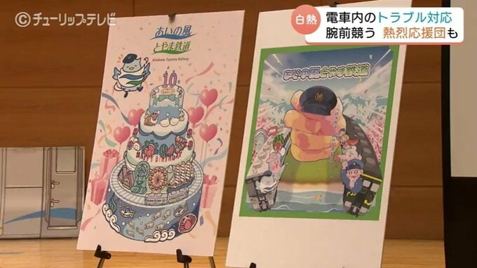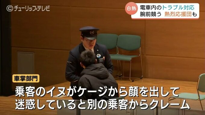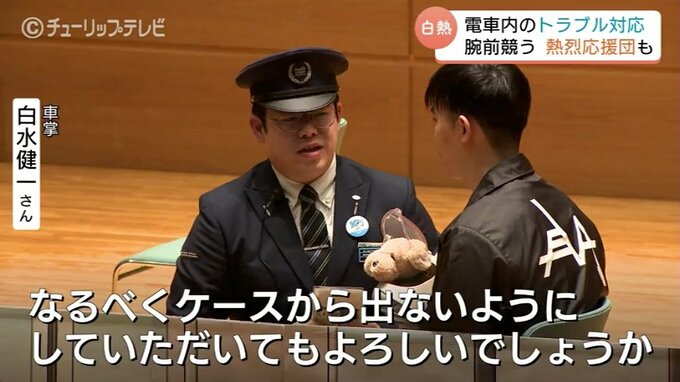 電車内で起きたトラブル対応の腕前などを競う大会が富山市内で開かれ、現役の車掌や駅員がしのぎを削りました。会場には、手作りのうちわや横断幕を持参する熱烈な応援団の姿もありました。