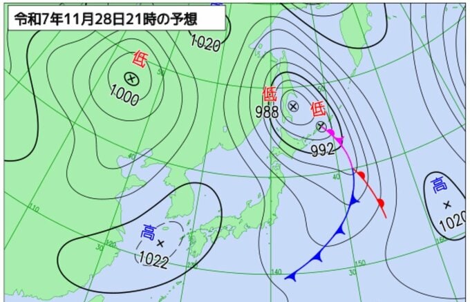 低気圧や前線に向かって暖かく湿った空気が流れ込み、28日には北陸地方の上空約5500メートルに氷点下24℃以下の寒気が入る見込みです。