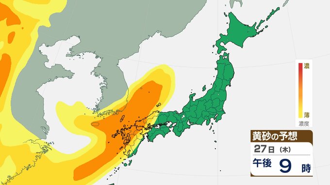 ニュースクリップ 【黄砂情報】西日本~東日本で黄砂飛来… 27日午後から28日にかけ視程10km未満に…交通への影響に注意【黄砂および雨と風のシミュレーション】 2025年11月27日(木) 12:05 国内 天気 黄砂の予想 27日(木)午後9時~