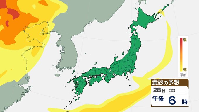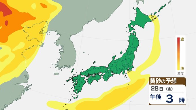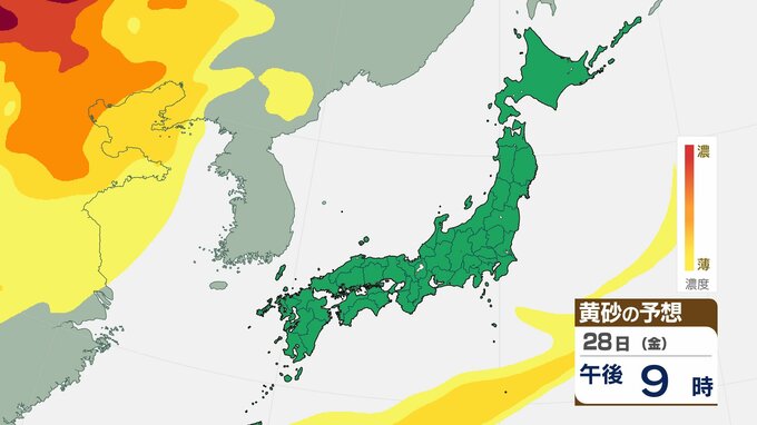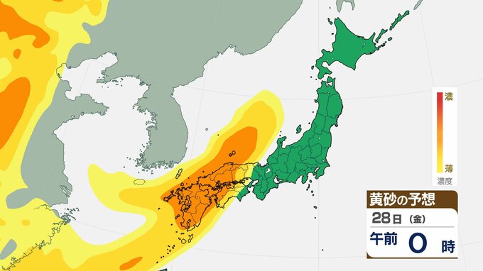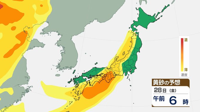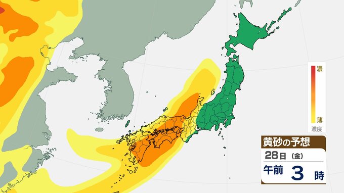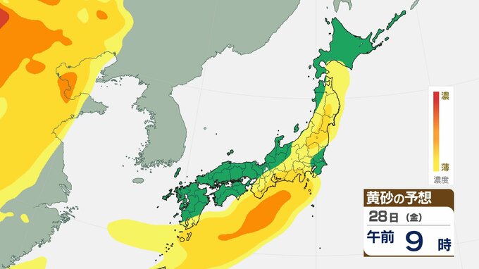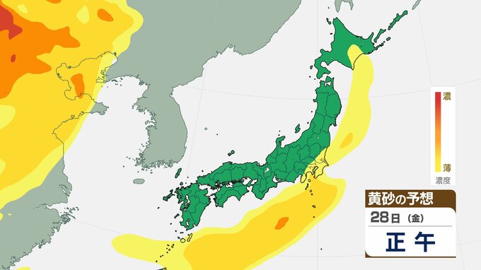 ニュースクリップ 【黄砂情報】西日本~東日本で黄砂飛来… 27日午後から28日にかけ視程10km未満に…交通への影響に注意【黄砂および雨と風のシミュレーション】 2025年11月27日(木) 12:05 国内 天気 黄砂の予想 28日(金)