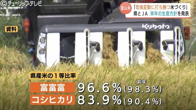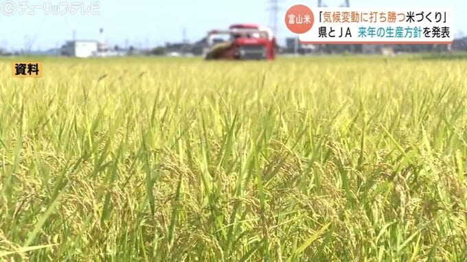 具体的には温暖化などの気候変動に打ち勝つコメ作りに力を入れるため「富富富」「てんたかく」など高温に耐性のある品種の作付け割合を30%以上に拡大するほか、気候に応じた水管理の徹底によるイネの活力の維持などを行うということです。