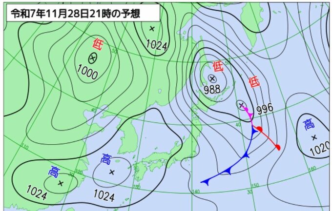 気象庁によりますと、発達中の低気圧が日本海北部にあって北東に進んでおり、寒冷前線が北陸地方を通過中です。28日は低気圧や前線に向かって暖かく湿った空気が流れ込み、上空約5500メートルには氷点下24℃以下の寒気が流れ込む見込みです。