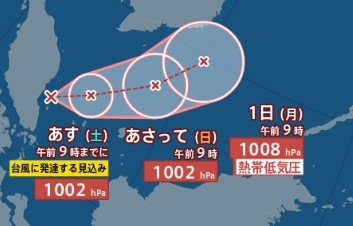 ▼30日午前9時には引き続き台風の勢力を維持したまま、南シナ海を北東に時速15kmで進む見通しです。中心気圧は1002hPa、中心付近の最大風速は18m/s、最大瞬間風速は25m/sと予想されています。
