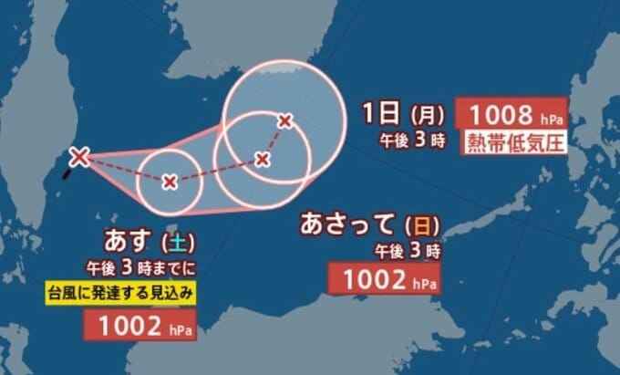 この熱帯低気圧は今後北上する見込みで、30日から1日にかけて進行方向が北東から北に変わると予想されています。また、一時台風に発達した後、1日には再び熱帯低気圧に弱まる見通しです。