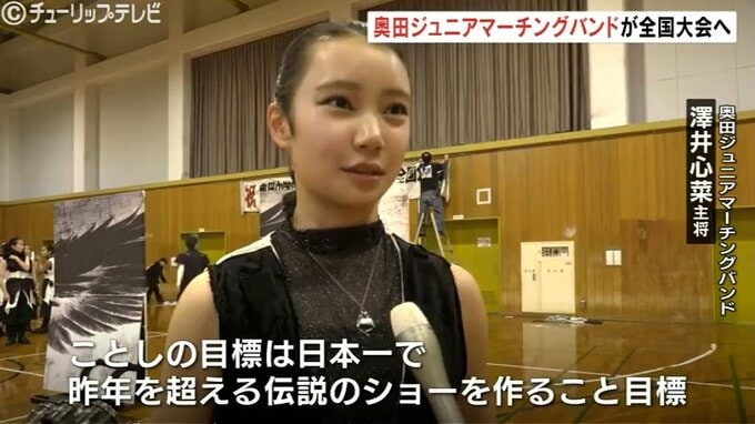 奥田ジュニアマーチングバンド・澤井心菜キャプテン:「ことしの目標は日本一で、昨年を超える伝説のショーをつくることを目標にしているので、残り日は少ないが、もっとチーム全員で頑張っていきたい」