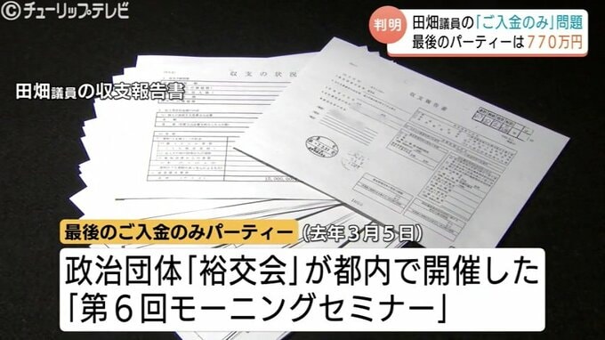 田畑議員の収支報告書を見ると最後のご入金のみパーティーは政治団体「裕交会」が去年3月5日に都内のホテルで開催した「第6回モーニングセミナー」だったことが分かりました。