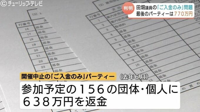 また、開催を中止した去年6月のご入金のみパーティーについては参加を予定していた156の団体・個人に対し、638万円を返金しました。