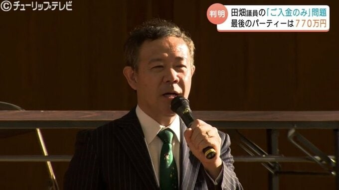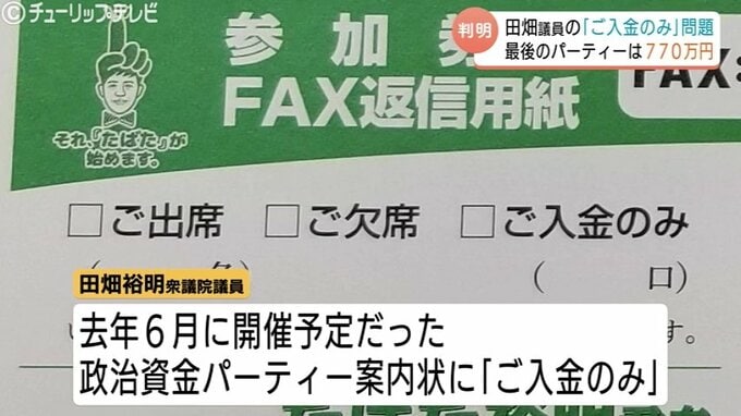 自民党の田畑裕明衆議院議員が「ご入金のみ」と記載した政治資金パーティーを開いていた問題で、開催した過去7回のうち、最後の「ご入金のみ」パーティーの収入が770万円だったことが分かりました。