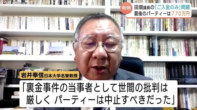 政治資金問題に詳しい岩井奉信日本大学名誉教授は「裏金事件の当事者として世間の批判は厳しく、パーティーは中止すべきだった」とコメントしています。