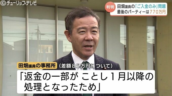 収入額は723万円だったため、差額の85万円について田畑議員の事務所は「返金の一部がことし1月以降の処理となったため」としています。