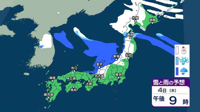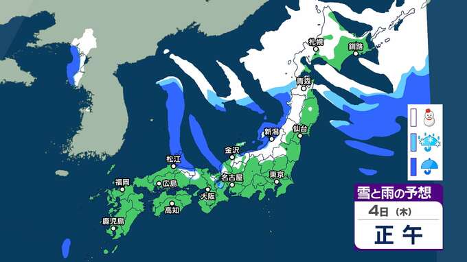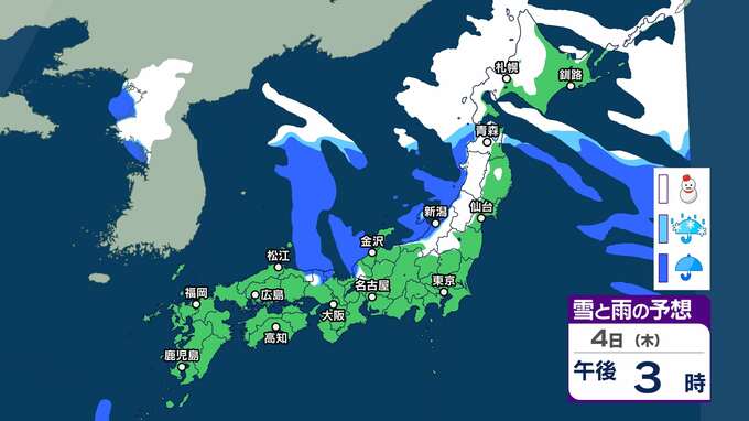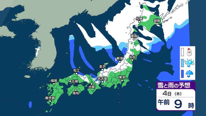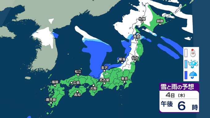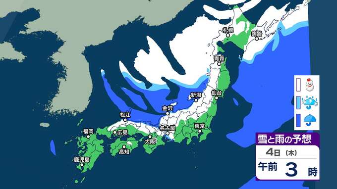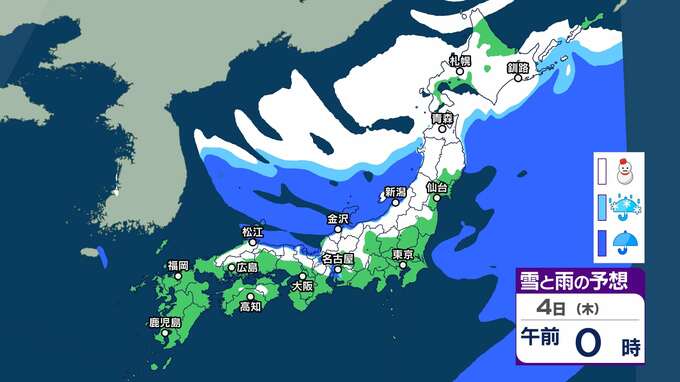 【雪情報】近畿地方上空約1500mに氷点下6度以下のこの時期としては強い寒気が流れ込む見込み 3~4日頃にかけて山地を中心に雪が降り、平地でも積雪となる可能性が【雪と雨のシミュレーション】 2025年12月2日(火) 12:49 4日(木)雪と雨のシミュレーション