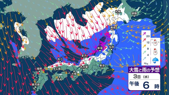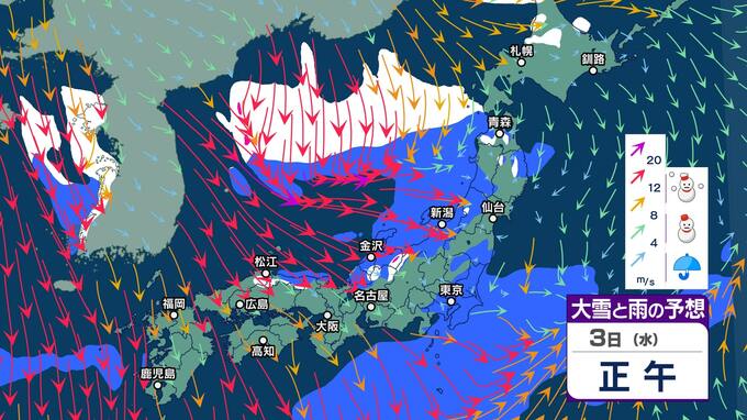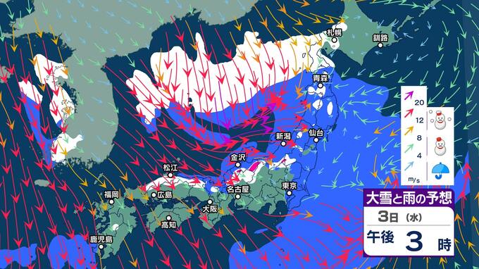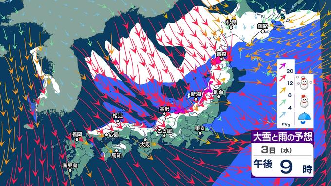 【大雪情報】関東北部・甲信で40センチの降雪か(4日6時までの予想24時間降雪量)関東甲信地方の上空約5500メートルには氷点下30度以下のこの時期としては強い寒気が流れ込む見込み【大雪と雨シミュレーション】 2025年12月3日(水) 09:36 国内 天気 3日(水)大雪と雨シミュレーション